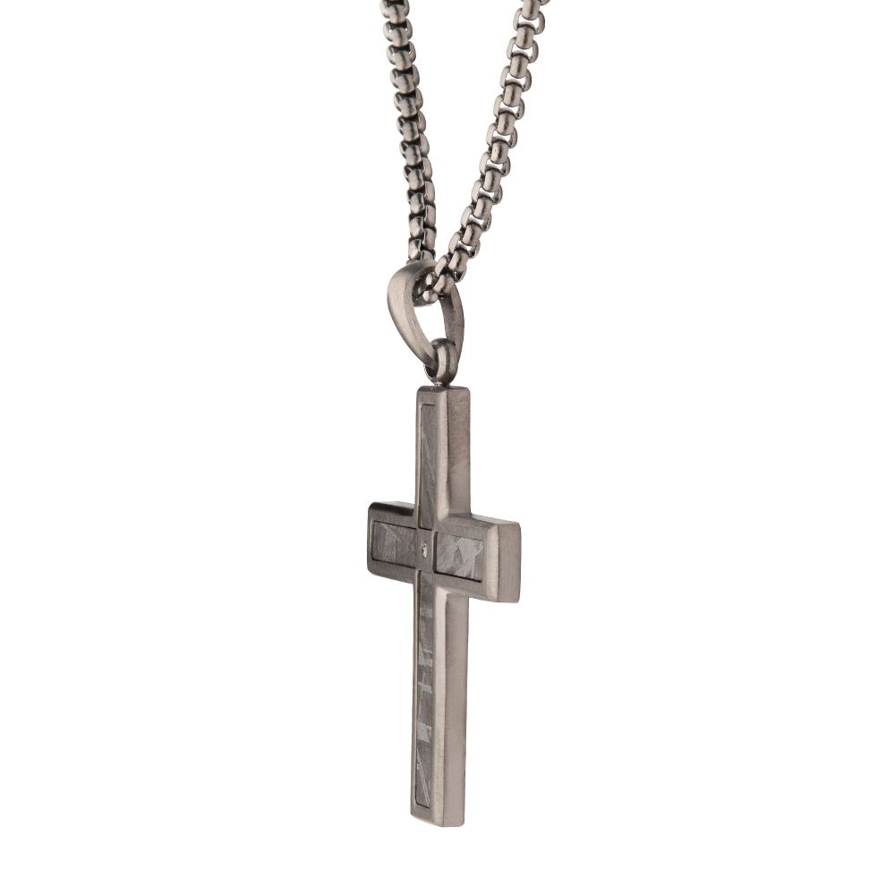 Men's Gun Metal Matte Finish Meteorite Inlay Cross Pendant